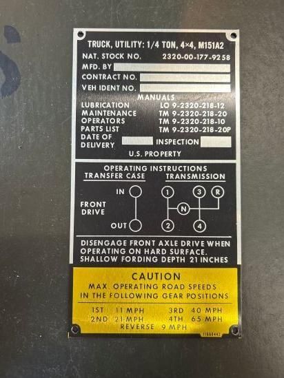 【米軍実物】1982年製 M151A2 ジープ用 データプレート デットストック